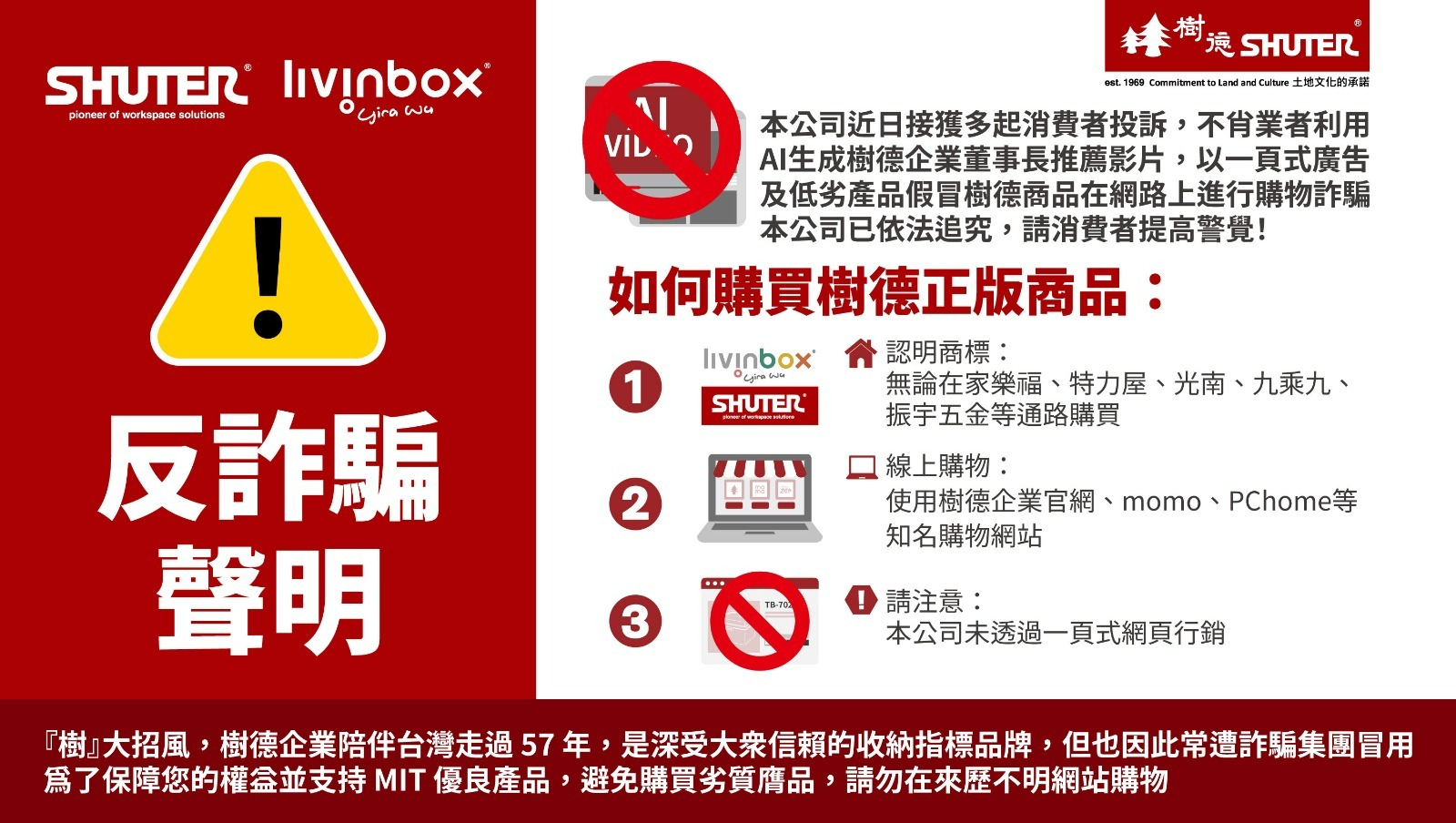 本公司近日接獲多起消費者投訴,不肖業者利用AI生成樹德企業董事長推薦影片,透過一頁式廣告以低劣產品假冒樹德商品,進行購物詐騙,本公司除依法律途徑告訴,也特別提醒消費者如何購買樹德產品: