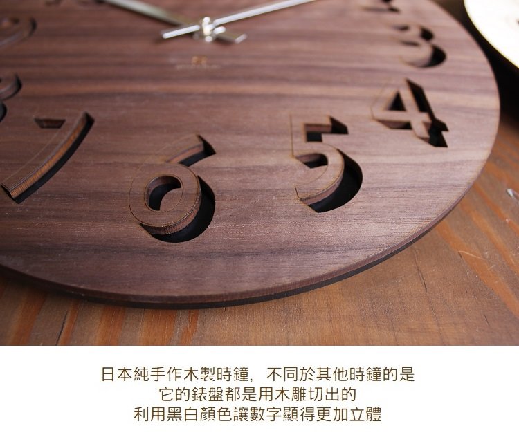 意為,師傅們利用一塊實木材加上魔術般的手工雕刻出一塊時鐘,使用特殊雕刻的方式讓數字顯得為立體感,近乎一體成形。黑桃色與白實木色都使適合擺設於任何一個設計空間內