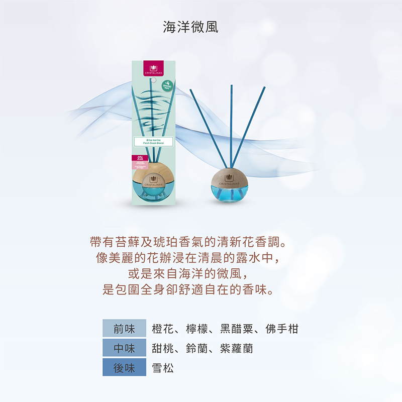 * 香氛持續時間是於CRISTALINAS實驗室,在氣溫22度,濕度40-45%的環境中測試而得,實際使用時間將依環境不同而略有差異。