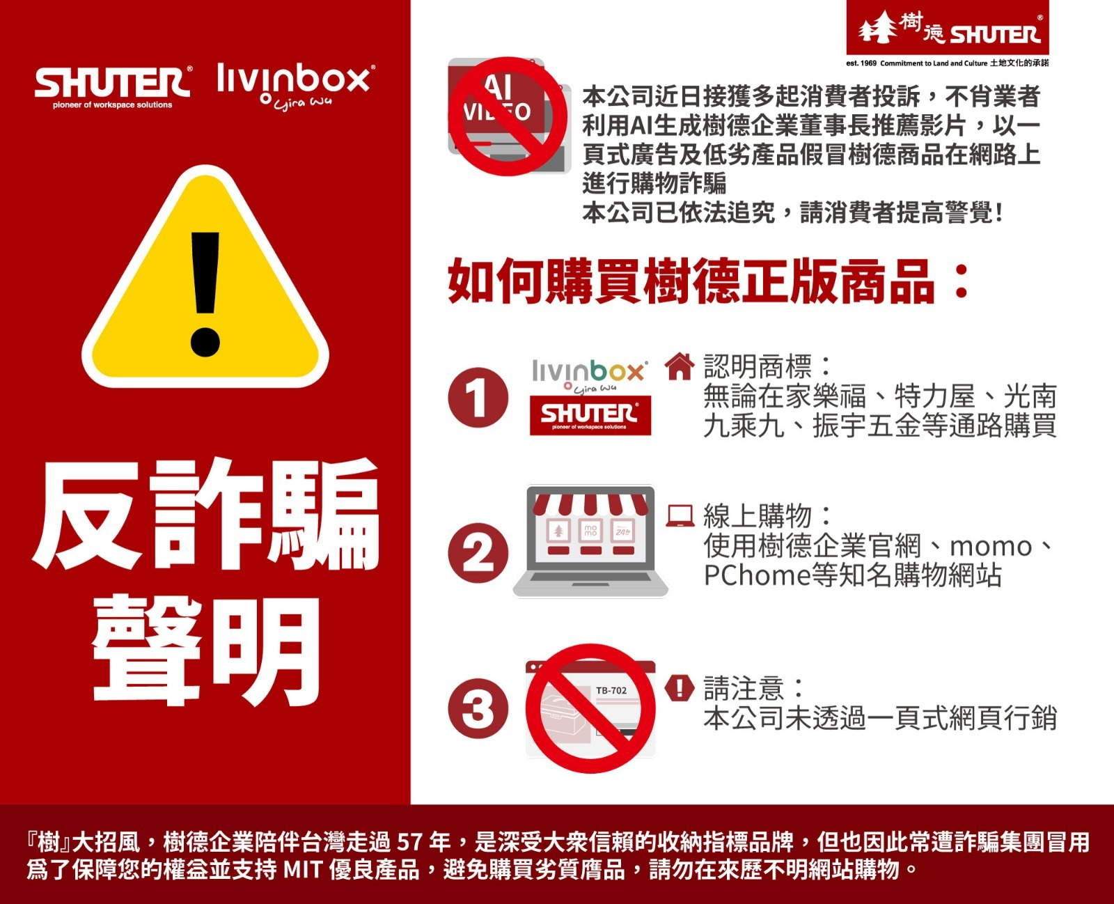 「樹」大招風,樹德企業57年歷史,執台灣收納產業之龍頭,歷來容易為仿冒、詐騙集團利用,支持MIT優良產品、避免購買劣質膺品,務請您不在來歷不明網站購物。